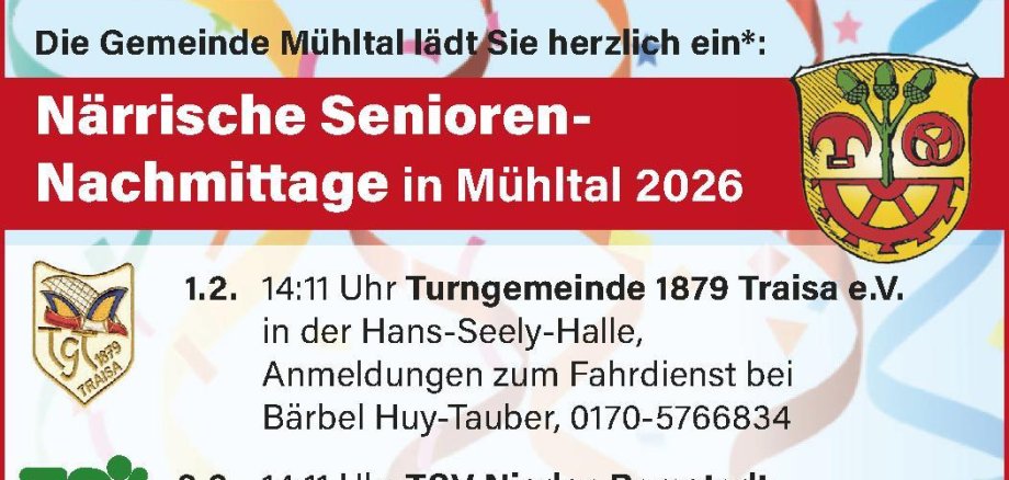 Die Gemeinde Mühltal lädt auch in diesem Jahr wieder herzlich zu den beliebten Närrischen Senioren-Nachmittagen ein. Alle Seniorinnen und Senioren sind willkommen, gemeinsam fröhliche Stunden in geselliger Runde zu verbringen und ein abwechslungsreiches karnevalistisches Programm zu genießen.